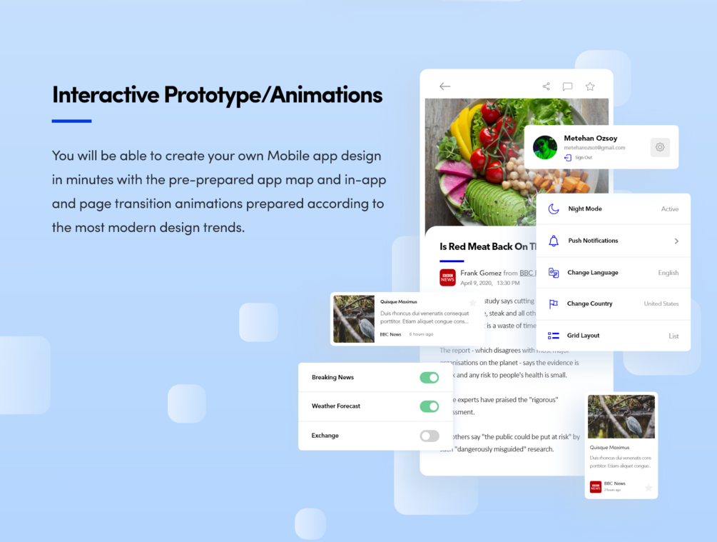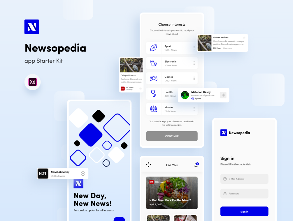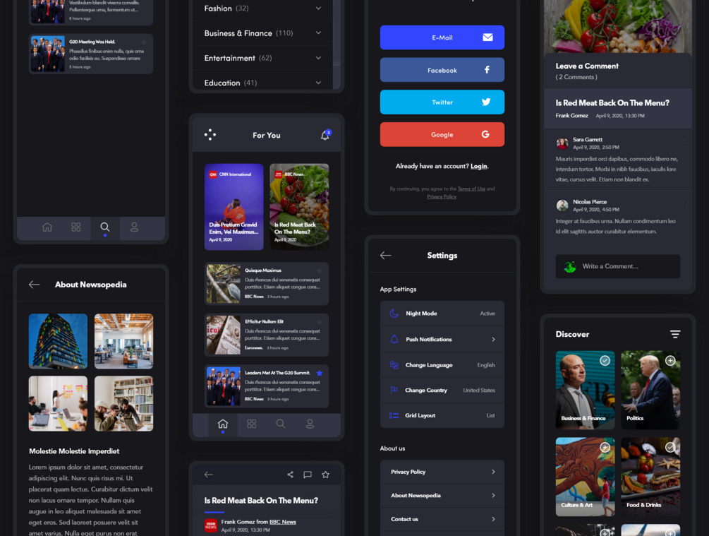 The Newsopedia App Starter Kit is a modern and uniquely created news app starter kit. It includes 56 screens (26 bright themes, 26 dark themes) designed for you to create your news app in minutes, a style guide and an interactive prototype prepared and supported with animations.